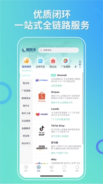 平台整合了Amazon、Shopee、Lazada、Monmall、Wish、eBay、希音Shein、速卖通、tiktok、temu拼多多等全球主流电商平台的资源,并配备专业顾问提供指导服务,助力卖家高效完成开店流程,提升运营效率,节约时间成本。