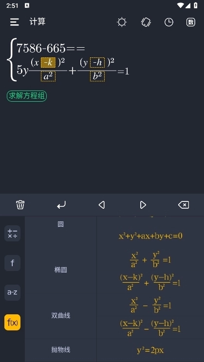 方程求解功能:可自动解算一元一次方程、二元一次方程组以及一元二次方程,只需输入对应的方程,再点击“解”按钮,就能得到答案和步骤指引。