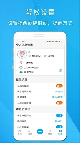 3、既能自由设置喝水提醒的时间,又能自由设定每次需饮用的水量,使用起来十分便捷。