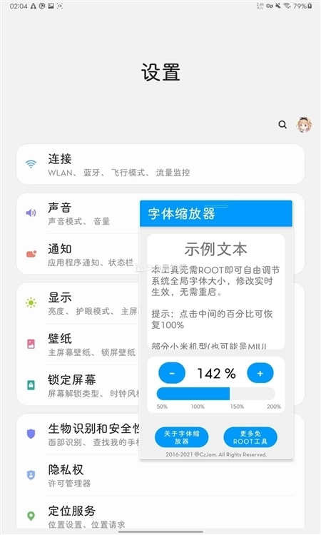 系统要求:仅支持Android 6.0及更高版本,且不需要ROOT权限,不过部分MIUI机型(例如旧版澎湃OS)可能由于系统限制,使得修改范围只能在80%到160%之间,一旦超出这个范围就会出现闪退情况。