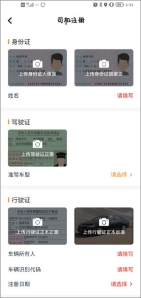 2、进入软件后,我们需要先把信息补充完整才能接单,按照平台的要求上传身份证、驾驶证、行驶证等各类信息的照片。