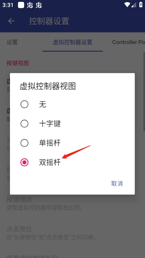 5、选择双摇杆模式,这样进入游戏后,虚拟按键就会呈现双摇杆的操作布局了。