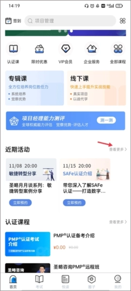 1、启动软件后进入首页,找到“近期活动”板块,点击其右侧的“查看更多”按钮。