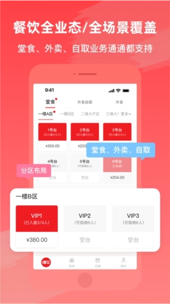 1、餐饮全业态/全场景覆盖:堂食、外卖、自取订单均支持模块化处理,订单详细数据、餐桌实时状态可通过可视化方式监测与操作,各项信息一目了然。
