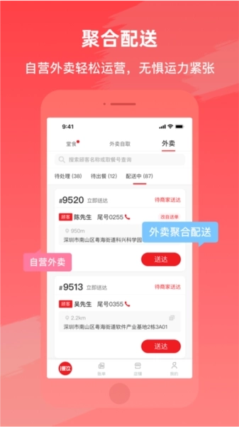 4、聚合配送模块:自营外卖业务,运营轻松便捷,整合多方骑手资源进行配送,有效应对运力紧张问题。