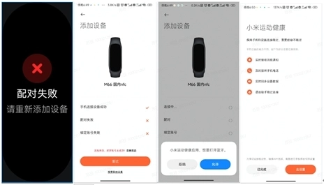 在进行绑定操作时,如果关闭了Android手机的蓝牙功能,手环会弹出“配对失败”的界面,小米手环也会显示绑定失败;此时若点击“重试”按钮,App会弹出提示用户开启蓝牙的对话框,只要重新打开蓝牙,就能顺利完成绑定。