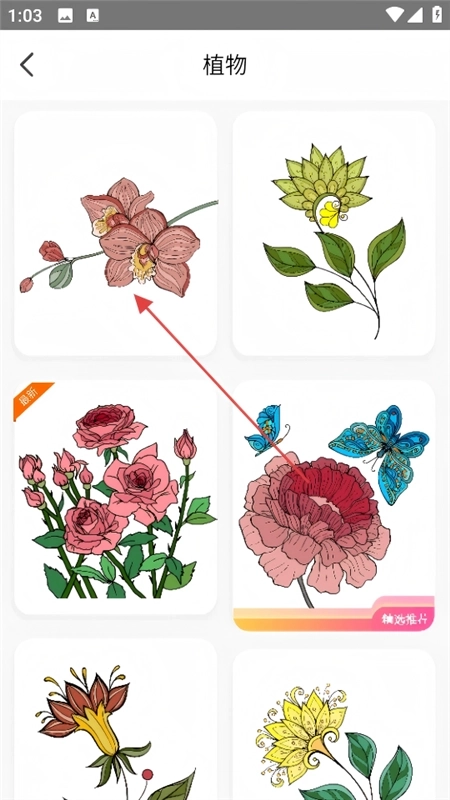 3、在植物填色素材列表里,挑选心仪的花朵素材,进入填色页面。