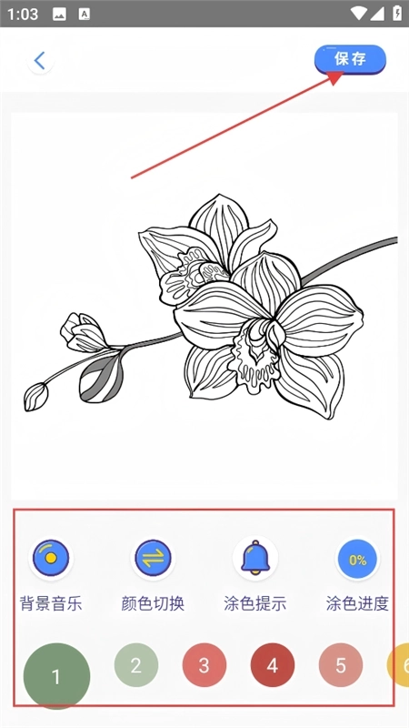 4、进入填色页面后,使用底部的工具进行填色操作,完成填色后点击右上角的【保存】按钮,即可留存创作的作品。