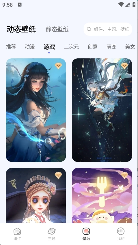 2、点击进入壁纸页面后,能看到丰富多样的类型,像动漫、游戏、创意等类别都包含在内。