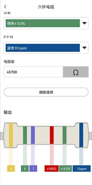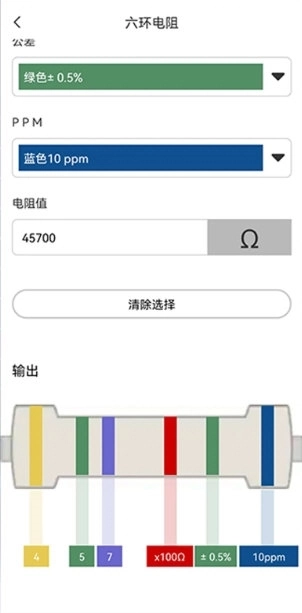 3、一个电阻色环拥有对应的两个色环和乘数,能实现快速计算,选择相应颜色后,电阻值便会自动得出。