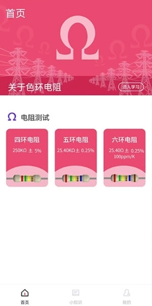 2、借助软件平台可直接查看首页选项,选择色环电阻相关内容,该平台支持四环、五环、六环这三类色环电阻的使用。