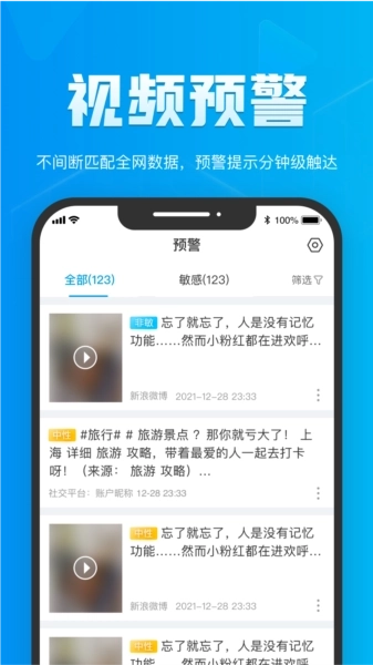 5、分类查看重点视频:索骥依据信源级别进行划分,可一键查看各类舆情信息,并且支持定制关注特定账号,确保重要信息随时可获取。