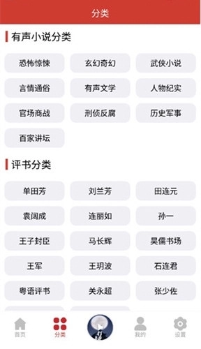 2、借助分类功能查找:点击底部的“分类”选项,即可看到“评书分类”板块,用户可依据自身喜好与需求挑选评书讲解员。