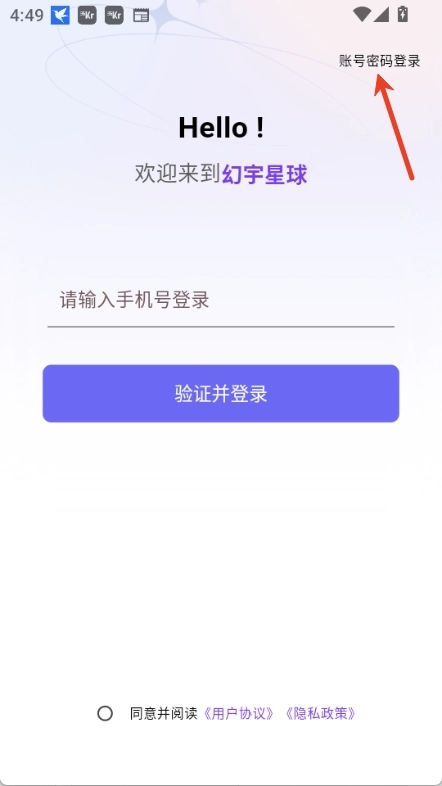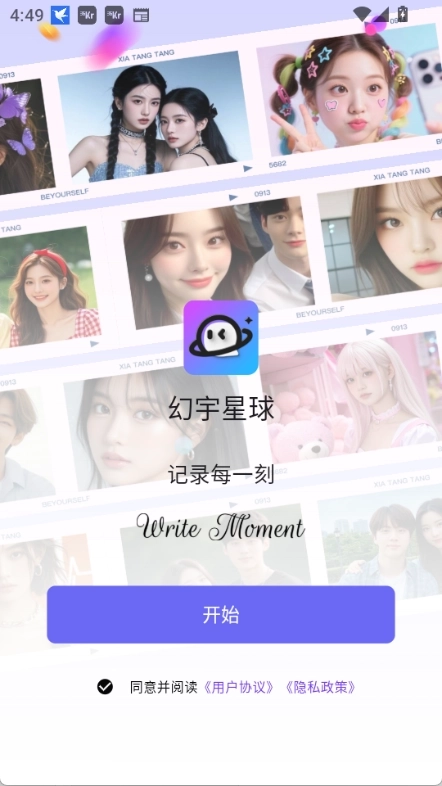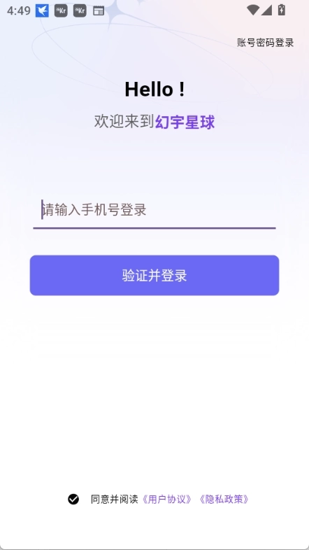 1、打开幻宇星球,同意隐私协议,点击开始