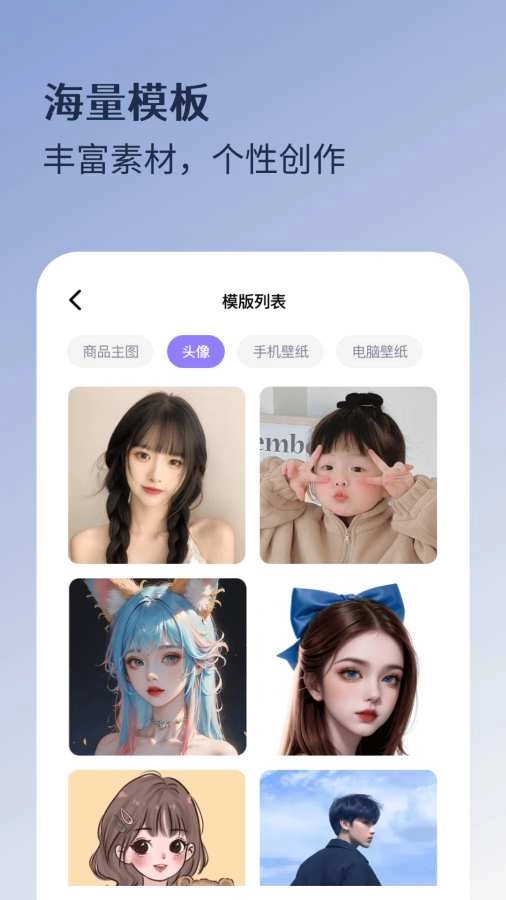 2、不管您是要制作电商商品海报、社交媒体内容、个性头像壁纸,还是其他类型的设计作品,都能借助浏览并挑选模板素材,快速将您的创意落地实现。