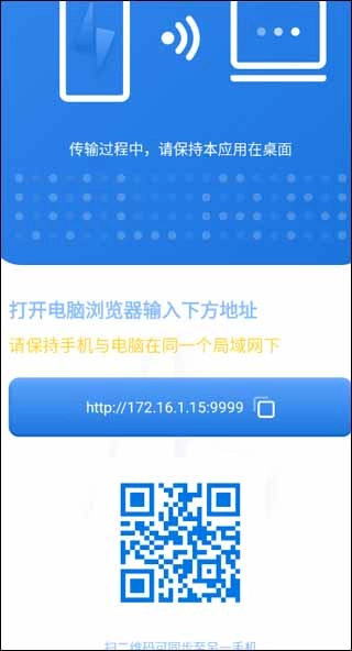 4、若要与其他设备互传文件,可使用另一个二维码进行扫描;若要与电脑互传,则需打开电脑浏览器,输入下方提供的地址,待同步完成后就能传输文件了。请注意:所有参与互传的设备必须处于同一个局域网环境中。