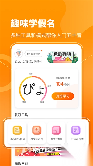 假名复习:涵盖完整的五十音表,配备智能复习提醒功能,助力反复夯实日语基础