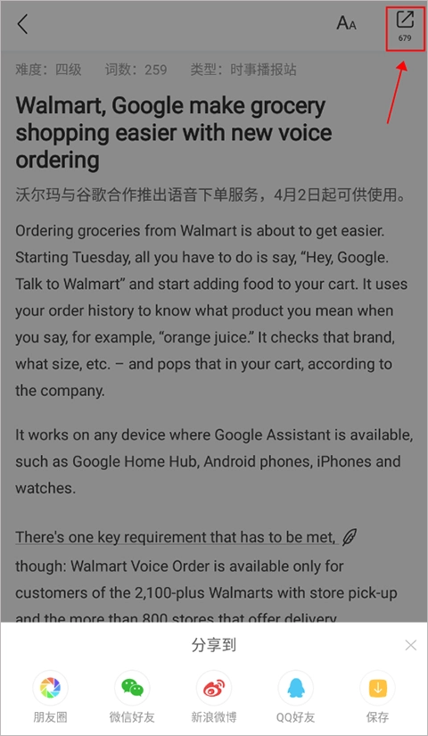 在文章页面点击右上角的“分享”图标,就能分享到其他平台进行查看啦。