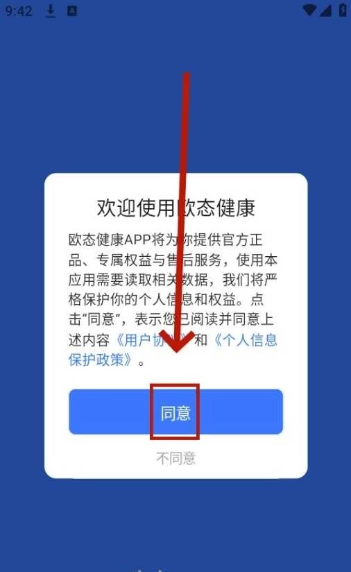 1、开启maitufit手表后,点击“同意”按钮来授予相关权限。