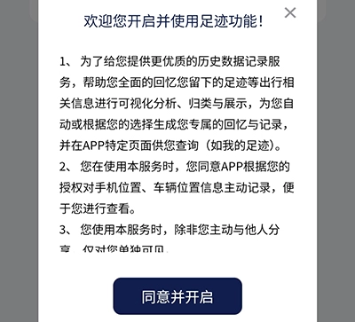 3、弹出提示后,点击“同意并开启”,即可查看自己爱车的行驶足迹。