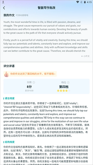 考研英语往往是不少考生的薄弱项,扇贝考研针对这一痛点,准备了丰富的英语备考资源,用户可以借助这些资源开展词汇记忆、阅读理解训练、听力练习等学习活动。除此之外,扇贝考研还提供英语作文范文和写作技巧指导,助力考生提升英语写作能力。另外,为了帮助考生快速提高英语写作水平,该应用引入了智能作文批改功能,考生在线提交英语作文后,系统会自动进行批改,并给出详细的修改建议,以便考生有针对性地提升写作水平,有需要的用户可以在本站使用这一功能。