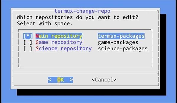 这里以清华大学开源软件镜像为例,在Termux里运行termux-change-repo命令,就能进入如下所示的图形界面。