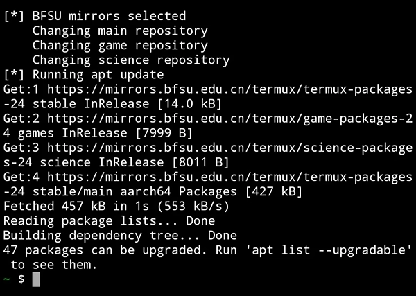 注:以下操作只适用于较新版的 Termux,如0.114,不适用0.73版的)(警告:镜像仅适用于 Android 7.0 (API 24) 及以上版本,旧版本系统使用本镜像可能导致程序错误。)