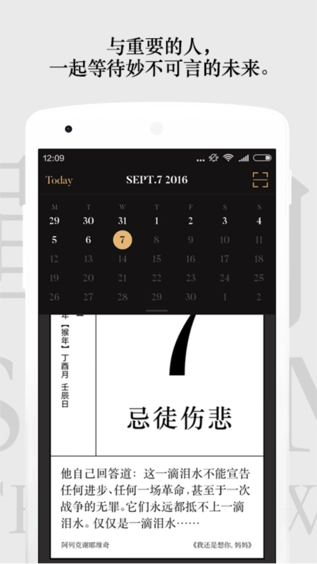 单向历是一款风格质朴的手机日历应用,它沿用了传统单向日历的界面设计,既保留了旧黄历的朴实感,又融入了增强现实技术,堪称新青年的“老黄历”。单向空间的爱书人们始终相信“人生即词语”——那些历久弥新的文字里,藏着能够驯服生活或让人与自我和解的奇妙力量。我们延续旧黄历那份朴实的仪式感,让2017年的每一天,都因文字与词语的点缀而不再平庸。它像一本立于书桌的实体日历,每日“翻开”新的一页时,仿佛生活正处在妙不可言的等待中,等待着任何一种可能的未来。