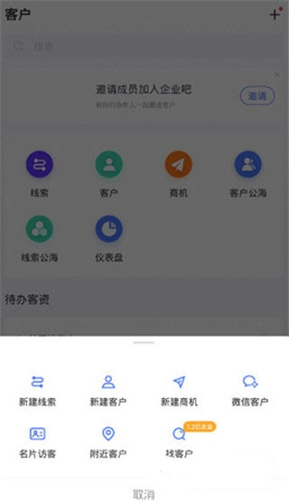 1、进入客户页面后,点击右上角的“+”按钮,然后选择【找客户】选项。