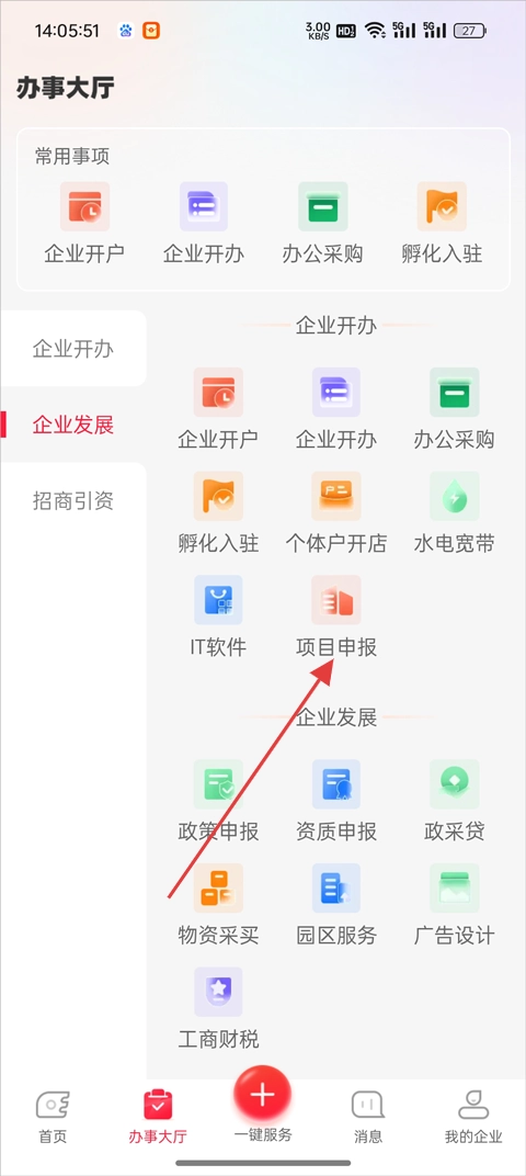 2、在办事大厅页面里找到【项目申报】并点击,启动申报流程。