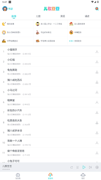 3、进入宝宝听页面,就能收听睡前故事、格林童话、成语故事、儿歌等内容。