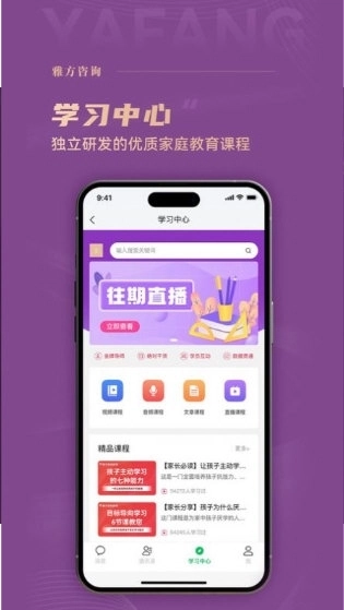 雅方咨询是一款在家庭教育服务领域具有引领地位的精品软件,致力于帮助用户改善亲子关系。用户能够浏览各类丰富的家庭教育资源,如文章、视频、音频以及课程等,并且可以依据自身的兴趣和实际情况,自主挑选不同主题与分类的内容,这些内容涉及亲子沟通技巧、孩子心理健康、学习习惯养成、性格塑造培养等多个方面,从而为用户带来个性化的学习感受。现在就使用雅方咨询,开启一段提升亲子关系的全新旅程吧!