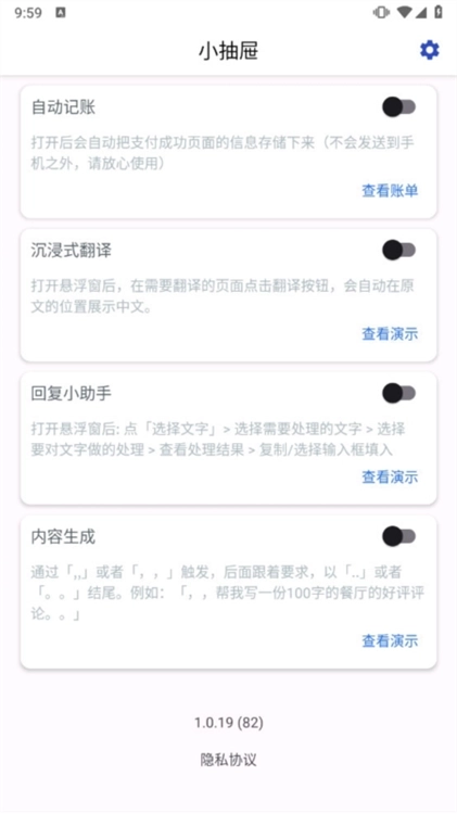 小抽屉屏幕翻译是一款功能多样的手机工具箱应用,核心亮点在于屏幕实时翻译功能,能让用户在手机任意界面即时获取外文内容的释义。作为一个线上综合工具平台,它不仅具备翻译能力,还集成了记账、邮件管理等实用工具,全方位覆盖用户的多元需求。其中,记账功能支持自动化记录,便于用户轻松打理个人财务;同时,软件对用户数据安全极为重视,通过先进加密技术筑牢隐私保护防线。