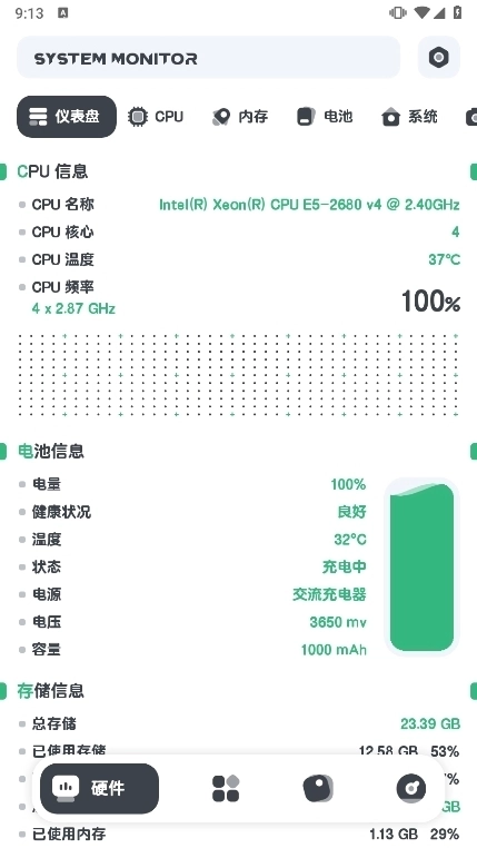 CPU监控:呈现各个核心的使用率、运行频率以及温度信息(若设备支持温度监测功能)。