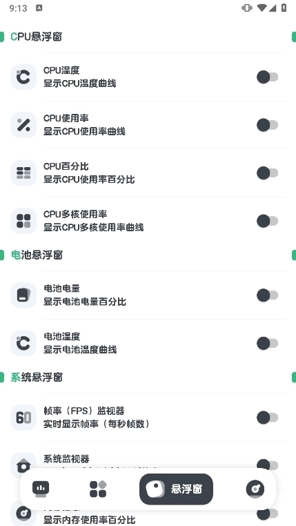 浮动窗口可实时展示CPU温度、电池温度以及RAM使用状况,其中包含状态栏浮动窗口与桌面浮动窗口两种形式。