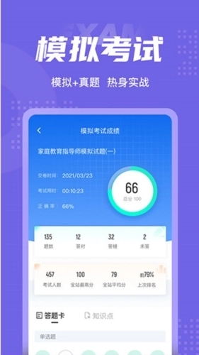 家庭教育指导师题库涵盖考点专项练习、全国通用卷与地区卷模拟训练,还设有按固定考试比重随机抽题的真题考场;成绩单会实时记录考试数据,细致反馈考生近期学习状态及正确率提升情况,能显著增强考生通过考试的信心。