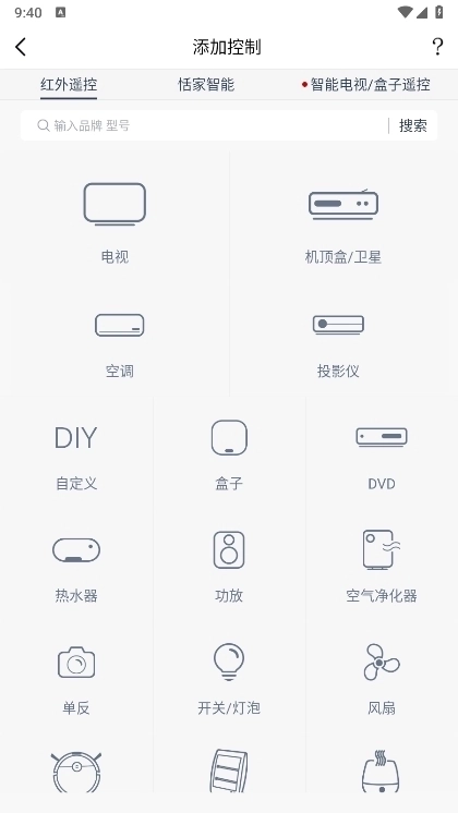 当找不到遥控码时,需退出当前匹配流程,回到“添加控制”界面,接着输入电器的品牌与型号,以便在云端用户库内进行搜索。