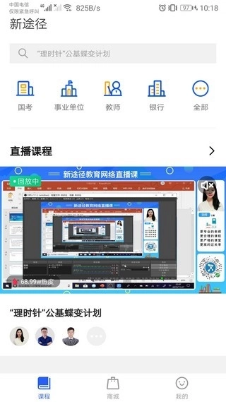1、主页设有“国考”“省考”“选调生”“事业单位”等各类考试科目的快捷入口,同时展示着正在直播的课程以及录播课程列表,便于用户查看直播课与录播课。