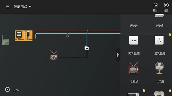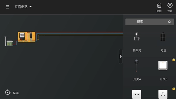 3、这里以家庭电路实验为例,右侧配备了实验所需的全部物品,能够真实模拟现实家庭电路的操作过程;
