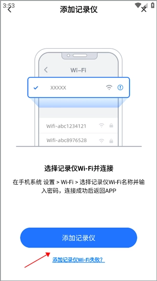 3、记录仪安装完毕并接通电源后,点击“添加记录仪”选项,系统会跳转至WiFi设置界面,此时连接记录仪对应的WiFi网络即可。