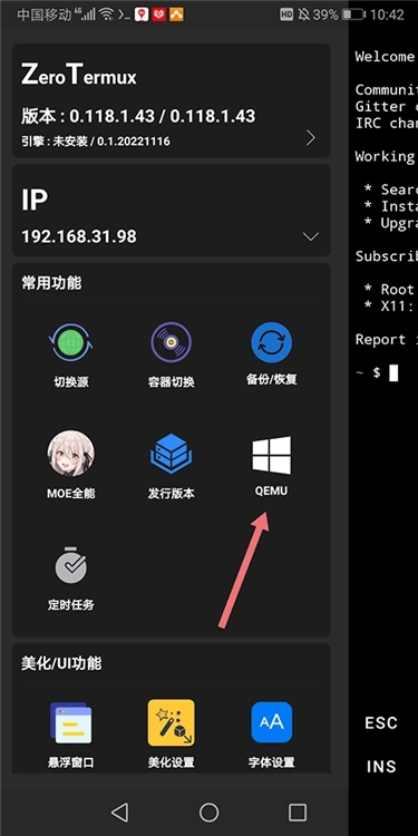 1、软件启动后向右滑动界面,在常用工具区域找到并点击【QEMU】选项,即可进入模拟功能页面。