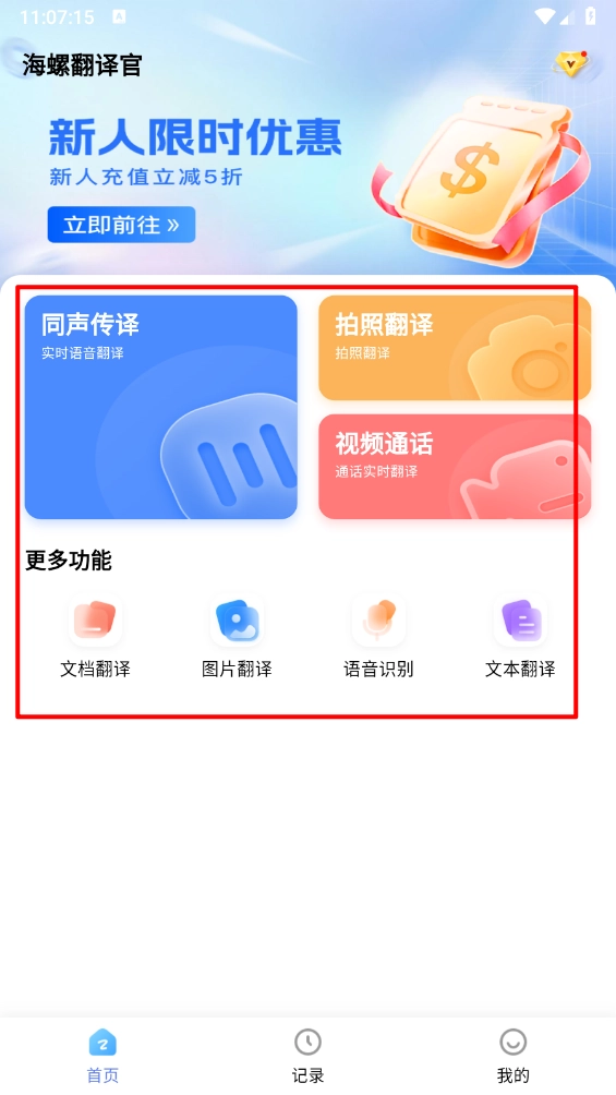 2、首页整合了多种翻译模式,用户可根据自身需求,一键快速进入对应的翻译功能页面。