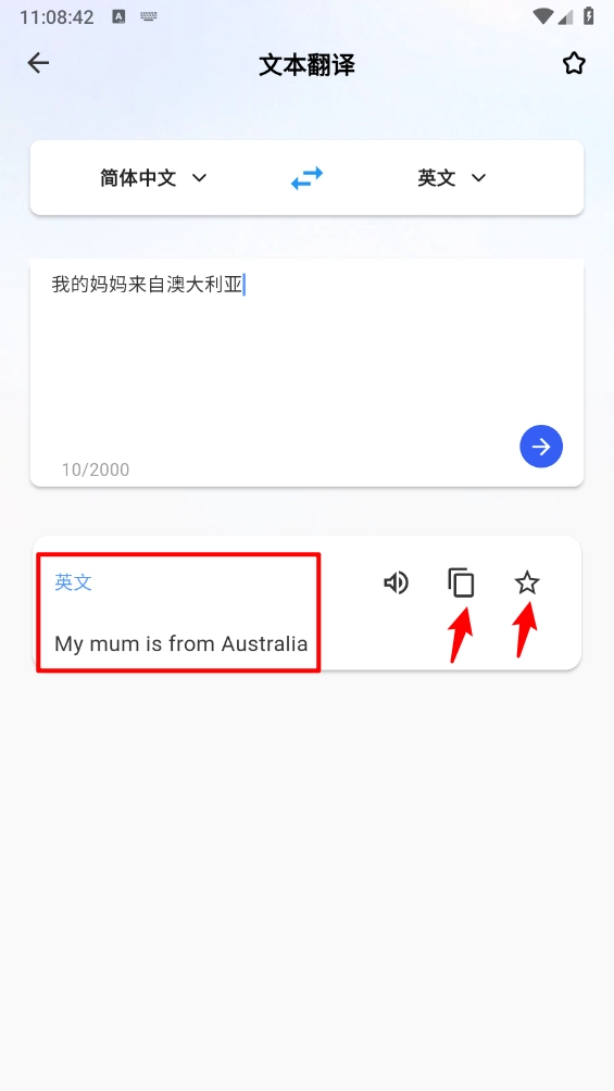 3、如图所示,点击进入文本翻译界面,输入需要翻译的内容,就能开展翻译操作,并且支持对所需翻译内容进行复制和收藏。