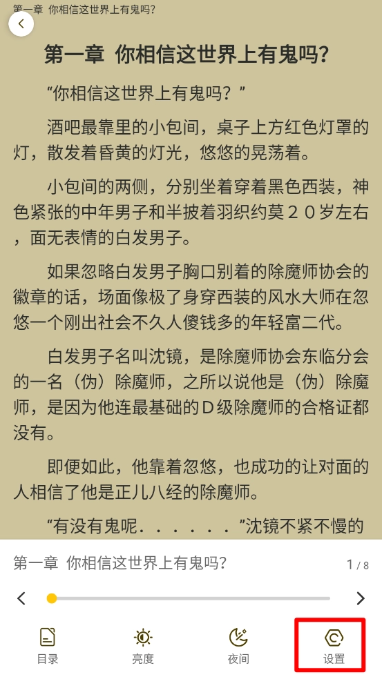 4、在阅读界面轻点中间区域呼出菜单,然后点击右下角的“设置”选项。