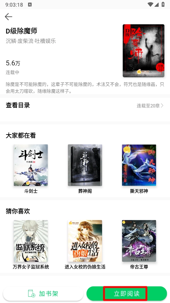 3、进入小说详情页,点击"立即阅读"。