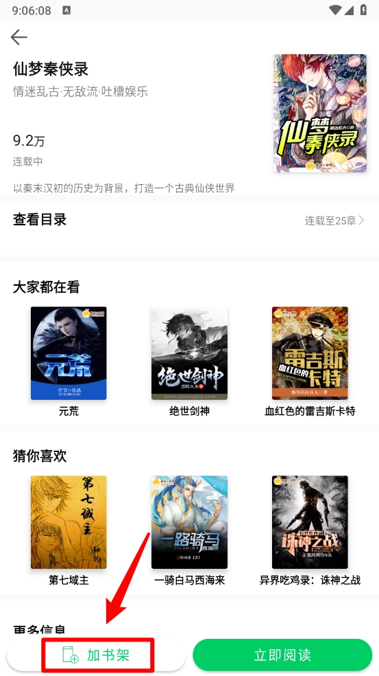 3、进入小说详情页,点击左下角"加入书架"。