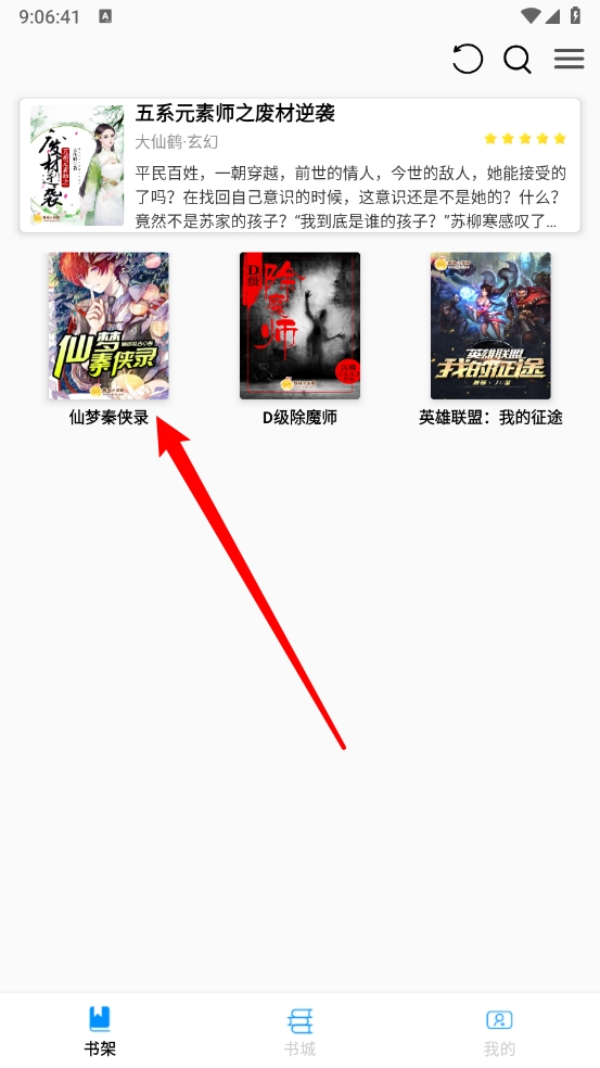 4、回到主页后进入书架板块,参照图示,就能查看已添加的目标小说。