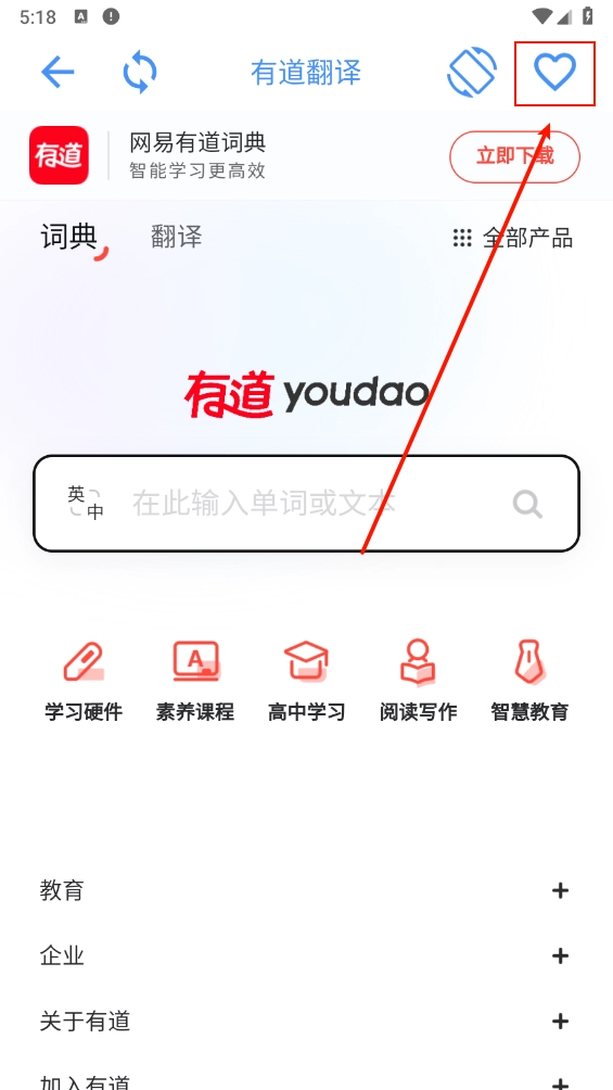 7、例如打开有道翻译就能直接使用,点击右上角的小爱心图标完成收藏操作就可以了。