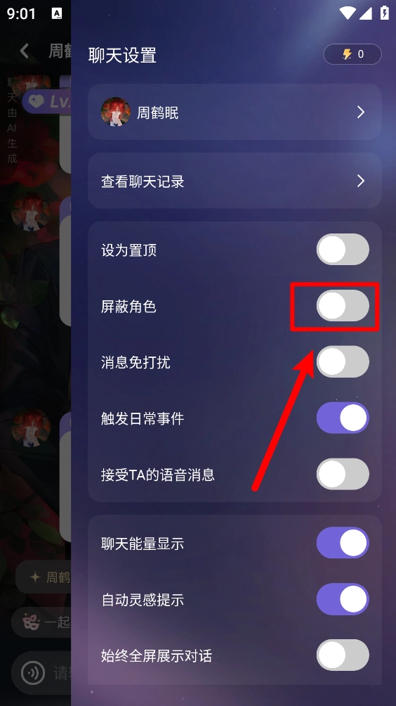 4、如图所示,最后打开屏蔽角色的开关即可。