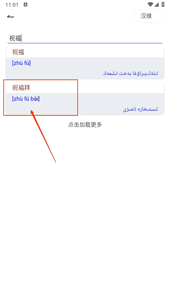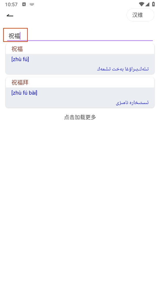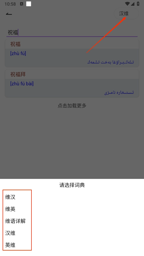 4、点击右上方的“汉维”按钮,即可切换对应的翻译词典。